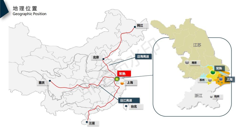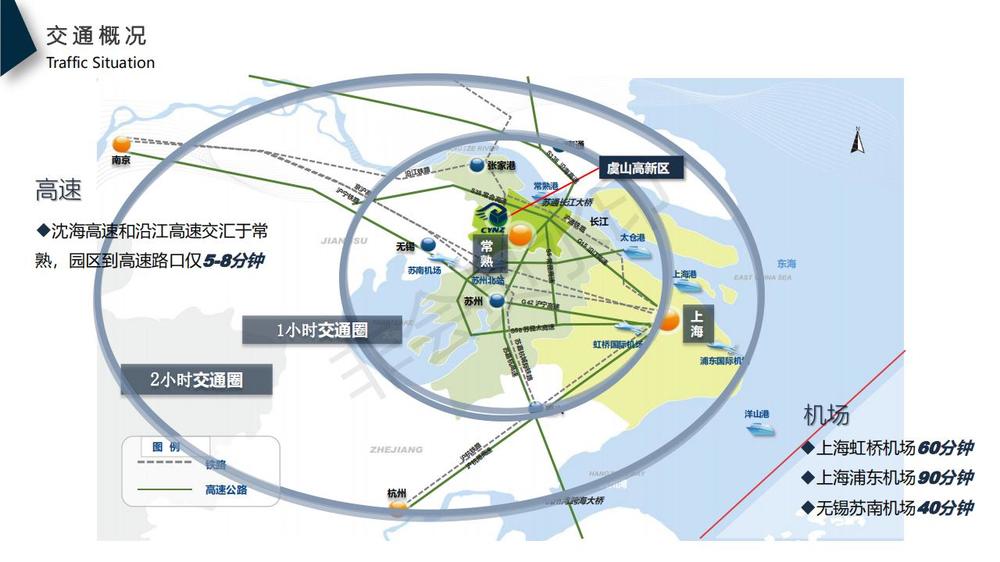 常熟位于长江三角洲的中心位置,紧邻上海。204国道、205、323省道贯穿全市,苏嘉杭高速和沿江高速交会常熟,连接长江太湖的五级绿色航道望虞河穿园而过。园区东距上海80公里,昆山30公里,南距苏州40公里,西至无锡40公里,北到常熟港20公里,与南通隔江相望。